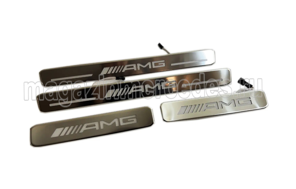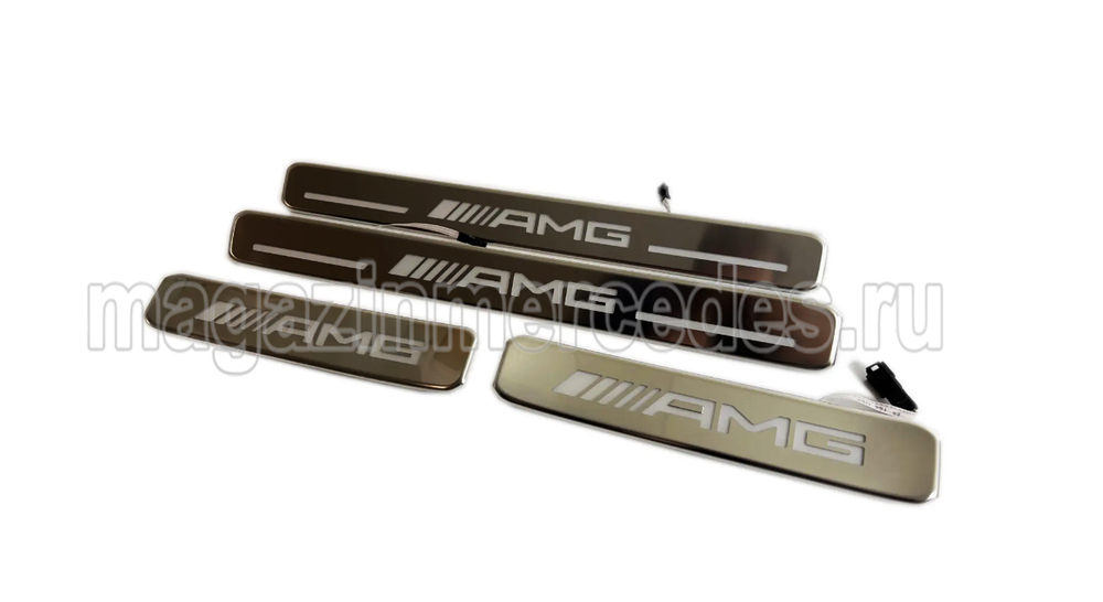 Оригинальные автомобильные аксессуары Mercedes-Benz: 4 накладки на пороги из нержавеющей стали AMG для НОВОГО Mercedes G-Class W463a W464 2018 модельного года. Эти накладки на пороги из высококачественной нержавеющей стали специально разработаны для нового Mercedes G-Class W463a W464 2018 модельного года. Они снабжены подсветкой и придают вашему автомобилю элегантный и спортивный вид. Накладки на пороги покрыты защитной пленкой, чтобы избежать царапин при транспортировке. Нижняя часть накладок на пороги снабжена клейкой стороной, поэтому их можно легко и надежно прикрепить к порогам вашего автомобиля. В комплект поставки входят две накладки на пороги передних дверей (левая/правая) и две накладки на пороги задних дверей (левая/правая). Размеры накладок на пороги передней двери составляют 49,0 x 5,0 см, а размеры накладок на пороги задней двери - 26,0 x 5,0 см. RS Genuine Carsupply предлагает вам проверенные и высококачественные оригинальные автомобильные аксессуары Mercedes-Benz по низким ценам. Купите сейчас онлайн и удобно с помощью Paypal автомобиль AMG st