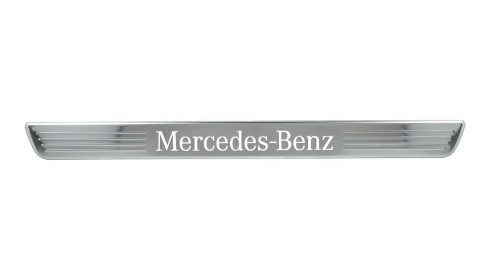 Хорошо выглядит и, в то же время, помогает лучше ориентироваться в темноте: серебристая сменная крышка с белой надписью «Mercedes-Benz» для накладки порога со светодиодной подсветкой. Сменная крышка убеждает не только простой установкой и точной посадкой, но также прочностью и долговечностью.