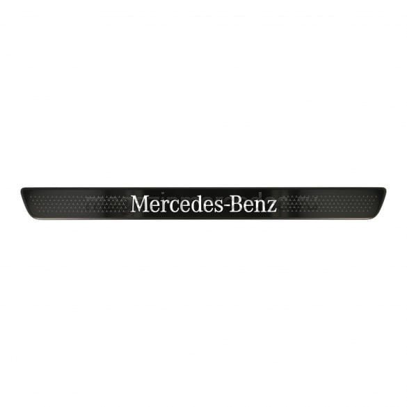Хорошо выглядит и, в то же время, помогает лучше ориентироваться в темноте: черная сменная крышка с белой надписью «Mercedes-Benz» и узором Mercedes-Benz для накладки порога со светодиодной подсветкой. Сменная крышка убеждает не только простой установкой и точной посадкой, но также прочностью и долговечностью.
