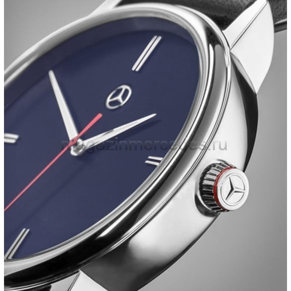 Современные наручные мужские часы с тремя стрелками для любого повода имеют корпус из нержавеющей стали с закаленным, просветленным с обеих сторон минеральным стеклом. Это обеспечивает оптимальную видимость циферблата цвета «Синий бриллиант» с четырьмя накладными двойными метками в положении «12 часов», «3 часа», «6 часов» и «9 часов». Дальнейшей изюминкой является объемная звезда «Мерседес-Бенц» на циферблате. Часовая и минутная стрелки стального цвета имеют люминесцентное покрытие Super-LumiNova®, что позволяет видеть время в темноте, а секундная стрелка выполнена в красном цвете. Черный кожаный браслет из телячьей кожи, разработанный согласно дизайнерской философии «Мерседес-Бенц», обеспечивает оптимальный комфорт ношения. - Цвет: «Синий бриллиант»/красный/черный - Материал: нержавеющая сталь/телячья кожа - Диаметр: 40 мм - Водонепроницаемые до 10 ATM - Кварцевый механизм Ronda 513