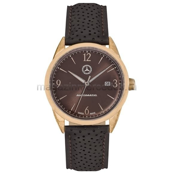 Элегантный дизайн для любого повода: наручные мужские часы Classic Automatic впечатляют высоким качеством отделки и корпусом из бронзы, который дополняют задняя крышка из нержавеющей стали и выпуклое, просветленное с обеих сторон сапфировое стекло. Через него открывается отличный вид на циферблат коричневого цвета с лучеобразной шлифовкой и накладными цифрами и метками. Через заднюю крышку из сапфирового стекла виден автоматический механизм Sellita SW 200. Часы имеют исторический логотип «Мерседес-Бенц» в положении «12 часов» и стрелки бронзового цвета. Коричневый кожаный ремешок с перфорацией и высококачественной классической застежкой из бронзы обеспечивает максимальный комфорт ношения. В результате химического процесса на бронзе со временем может образоваться налет патины, который изменит ее цвет. При разработке часов согласно дизайнерской философии «Мерседес-Бенц» особое внимание было уделено использованию натуральных материалов. На сегодняшний день бронза является очень популярным в области аксессуаров материалом для производства часов и украшений для мужчин. - Цвет: бронзовый/коричневый - Материал: бронза/нержавеющая сталь/кожа - Диаметр: 42 мм - Возможно образование оттенка патины - Водонепроницаемые до 5 ATM - Часовой механизм Sellita SW 200 с автоподзаводом - Сделано в Швейцарии