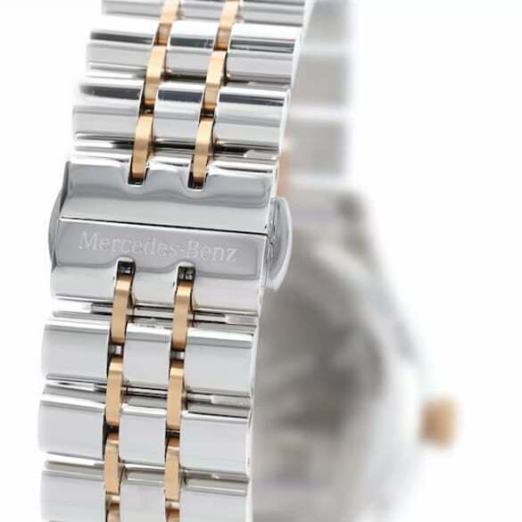 Оригинальные мужские часы Mercedes-Benzс кварцевым механизмом Swiss 510 BigDate от Ronda расставляют акценты с помощью корпуса из полированной нержавеющей стали и золотистого матового безеля. Циферблат, защищенный антибликовым и слегка выпуклым сапфировым стеклом, выполнен в черном цвете. Дата отображается через рамочное окошко для обеспечения хорошей читаемости. Браслет из нержавеющей стали в двухцветном исполнении из серебра и золота, который можно надежно закрепить на запястье с помощью элегантной застежки-бабочки, обеспечивает удобную посадку. Золотистые области имеют PVD-покрытие. Чтобы гарантировать надежное считывание времени даже в темноте, индексы и стрелки покрыты люминесцентным материалом SuperLumiNova®.