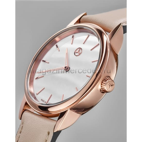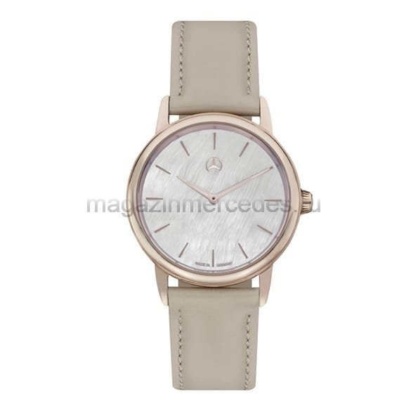 Элегантные женские часы в корпусе из нержавеющей стали с PVD-покрытием цвета розового золота, с закаленным минеральным стеклом и антибликовым покрытием с обеих сторон. Циферблат с перламутровым эффектом с нанесенными на него часовыми метками. На уровне 12:00 находится рельефная звезда Mercedes.