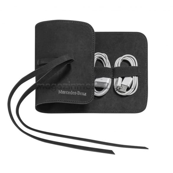 С органайзером кабелей черного цвета раздражающий кабельный беспорядок останется в прошлом. Практичный аксессуар сделан из качественной нубуковой кожи и имеет удобную ручку с бархатистой поверхностью. Он отлично подходит для хранения электронных аксессуаров и, благодаря различным петлям, обеспечивает идеальный порядок среди кабелей, штекеров или зарядных устройств. Кожаными ремнями кабельный органайзер надежно закрывается. Тисненый логотип «Мерседес-Бенц» – завершающий элемент в дизайне интерьера.