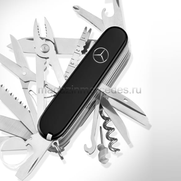 Идеальный инструмент на все случаи жизни: перочинный нож Swiss champ Victorinox из нержавеющей стали – практичный офицерский нож, который включает в себя 33 инструмента. В набор инструментов наряду с большим и маленьким лезвием для резки входят такие практичные инструменты, как пробойник, шило и кернер, консервный нож, отвертка, открывалка, ножницы, инструмент для очистки проводов от изоляции, комбинированные плоскогубцы, кусачки для проволоки, ножовка для металла, лупа, пинцет и шариковая ручка с нажимным механизмом. Для любителей рыбалки высококачественный нож предлагает приспособление для удаления рыболовного крючка, а также инструмент для очистки рыбы от чешуи. Компактный нож длиной 91 мм удобно разместится в любом рюкзаке.