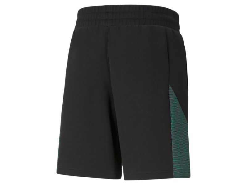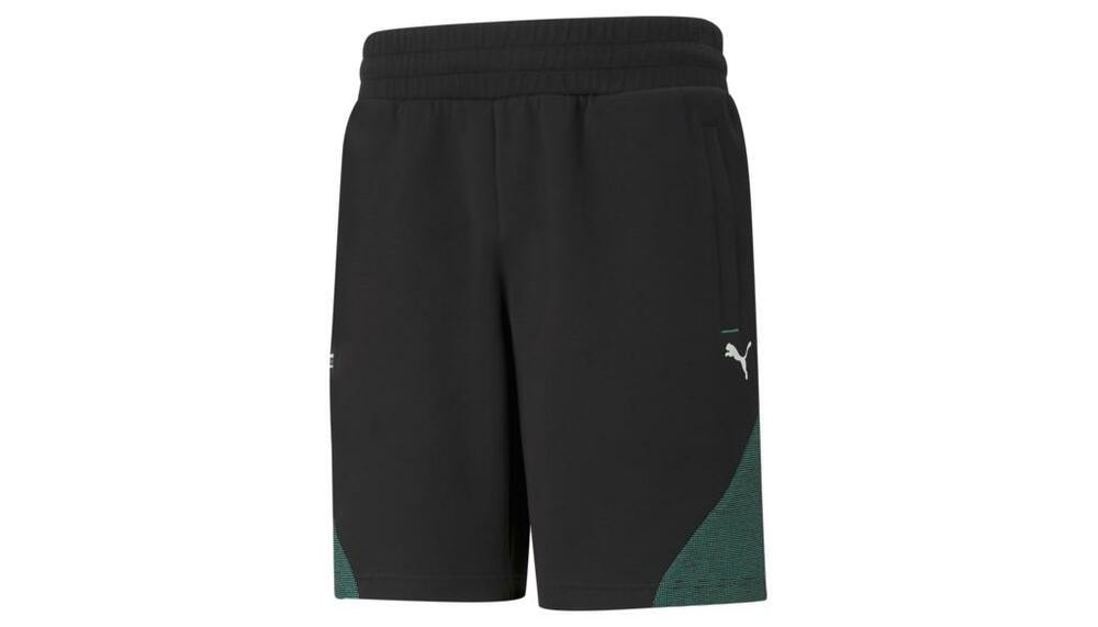 отличающиеся повышенным удобством: черные трикотажные шорты из хлопковой ткани приятно надевать и на тренировку, и в свободное время – при этом они отлично выглядят. Выдержанный в черном цвете дизайн дополнен просвечивающимся зеленым декором, отражающей свет окантовкой и поясом в рубчик 2 x 2. Логотип MERCEDES AMG PETRONAS FORMULA ONE, а также логотип PUMA Cat идеально дополняют дизайн этих мужских шорт.