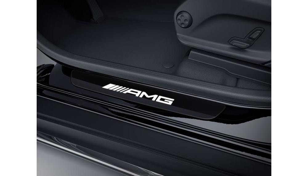 Визуально яркий аксессуар, который служит для лучшей ориентации в темноте: черная сменная планка с надписью «AMG» белого цвета для накладки порога со светодиодной подсветкой. Сменна планка из глянцевой нержавеющей стали убеждает не только простой установкой и точной посадкой, но также прочностью и долговечностью.