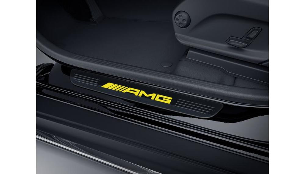 Сменная крышка AMG для накладки порога со светодиодной подсветкой из черной сатинированной нержавеющей стали с надписью «AMG» желтого цвета.