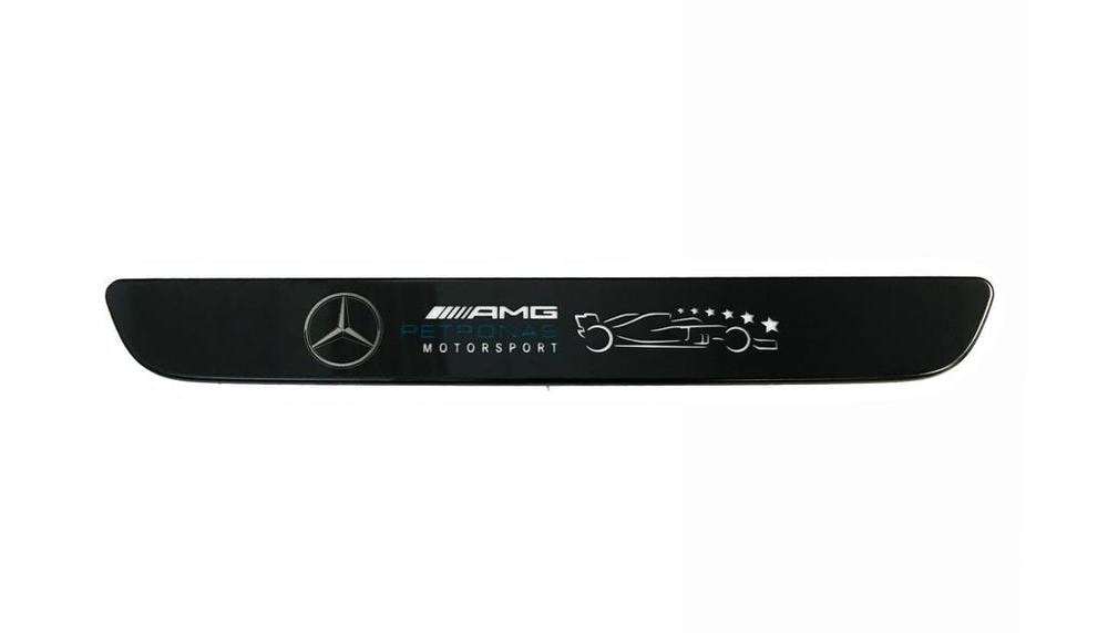 Высококачественной сменной крышкой для накладки порога с подсветкой поклонники гоночного спорта создают атмосферу «Формулы-1» в своем собственном автомобиле. С одной стороны, сменная крышка из нержавеющей стали с черным покрытием отображает контуры Mercedes-AMG Petronas, а шесть звезд символизируют шесть побед. С другой стороны, серебристая выгравированная звезда Mercedes и надпись «Petronas» привлекают к себе внимание. Серебристая звезда Mercedes сияет без подсветки, надпись «Petronas» представлена зеленой подсветкой, в то время как другие детали дизайна с белой подсветкой указывают путь в салон автомобиля. Накладка порога был изготовлена по случаю шестой победы в чемпионате мира среди гонщиков и конструкторов команды «Формулы-1» Mercedes-AMG Petronas.