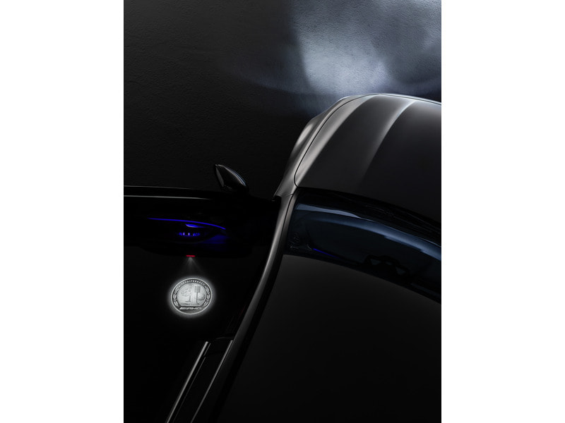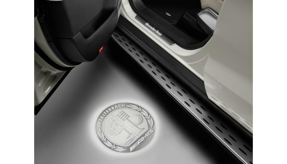 Впечатляющий облик: Инновационные светодиодные проекторы эмблемы при открывании двери водителя и переднего пассажира проецируют эмблему AMG с трехмерным эффектом на пол зоны дверного проема.