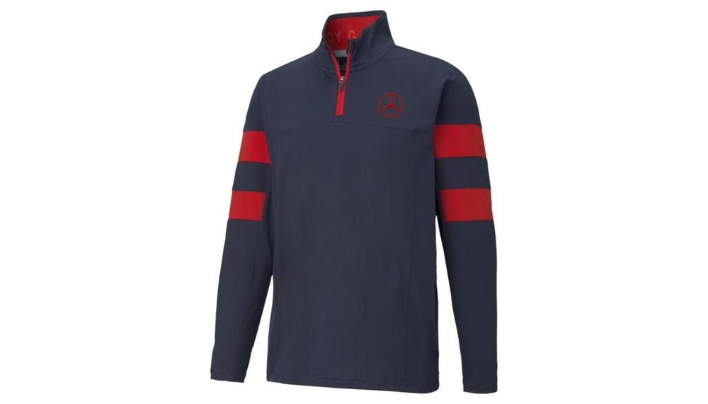 Причин для отговорок нет: с этим свитером для гольфа для мужчин на поле приятно будет выходить и в холодные дни. Этот легкий предмет верхней одежды хорош и в своем стильном дизайне темно-синего цвета с красными полосками на рукаве, небольшим воротником-стойка с молнией на одну четверть и объемным принтом в виде звезды Mercedes-Benz на груди. На этом его преимущества не заканчиваются: свитер очень функционален: его воздухопроницаемый, тянущийся в 4-х направлениях эластичный материал отводит влагу от тела наружу и обеспечивает даже в сложных партиях высокий уровень комфорта ношения.