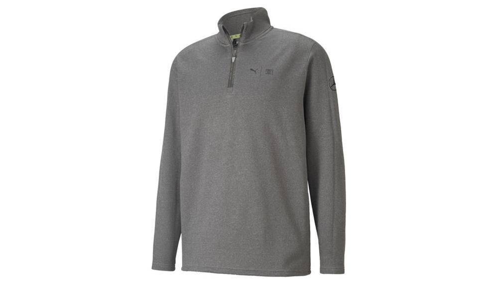 В стильной одежде на поле для гольфа и в холодную погоду: легкий свитер для гольфа для мужчин цвета «серый меланж» оснащен небольшим воротником-стойка с молнией на 1/4, обеспечивает комфортную носку и не ограничивает движения при ударах по мячу. Чтобы во время игры хорошо отводить наружу пот и создавать приятное чувство сухости на кожи, этот функциональный предмет одежды изготовлен из качественного стопроцентного полиэстера (и на 61 % рециклированного). Принт в виде звезды Mercedes-Benz на рукаве выступает как завершающий элемент в дизайне свитера для гольфа.
