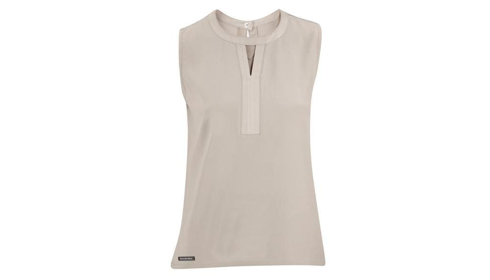 Будь то соло или под блейзером: бежевый женский топ – идеальный выбор во многих случаях. Прекрасным качеством и модными деталями отличается этот топ, обращающий на себя внимание более длинным кроем сзади, круглой горловиной с кнопкой серебристого цвета сзади, небольшими боковыми разрезами, а также вставкой в передней части из блестящего материала. Черная нашивка из замши с серебристой надписью «Mercedes-Benz» на подоле передней части завершает удачный образ. Кроме того, он превосходен и по комфорту ношения благодаря слегка приталенному силуэту Modern Fit, а также использованию высококачественных материалов.