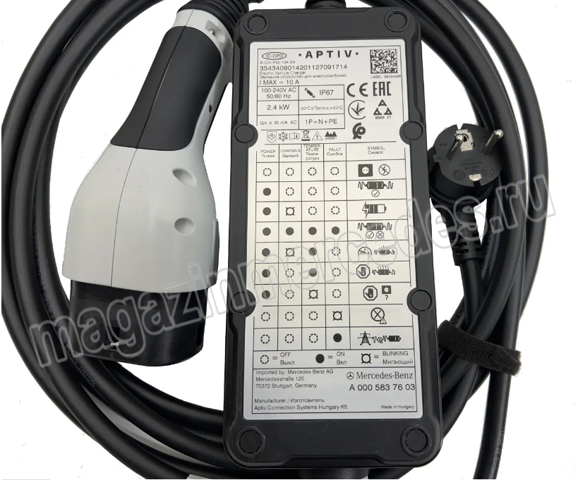 Описание продукта: Оригинальный зарядный кабель Mercedes-Benz, также известный как кабель Mode 2, позволяет заряжать аккумулятор автомобиля от бытовой розетки мощностью до 2,3 кВт (230 В, 1 фаза, 10 А) и подходит для розеток E / F CEE 7/7.