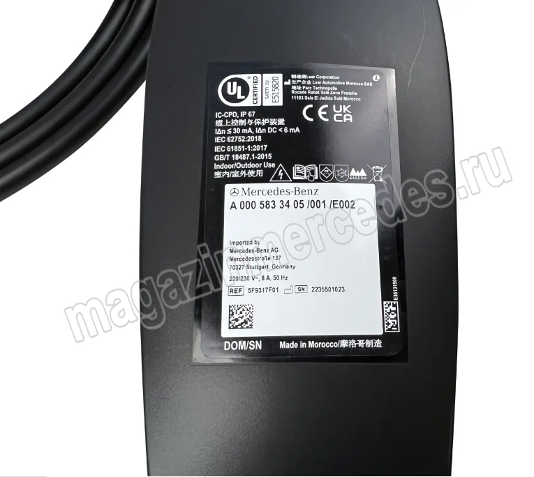 Оригинальный зарядный кабель Mercedes-Benz Длина: 5 метров, гладкий Код комплектации: B30 Зарядный кабель для бытовой розетки 230 В, 1 фаза, 10 А 2,3 кВт Зарядный кабель для бытовой розетки типа E/F Оригинальные аксессуары Mercedes-Benz Кабель режима 2 Длина 5 м Новый и неиспользуемый Подходит для многих моделей эквалайзеров и гибридных автомобилей Mercedes-Benz Номер детали: A000 583 34 05
